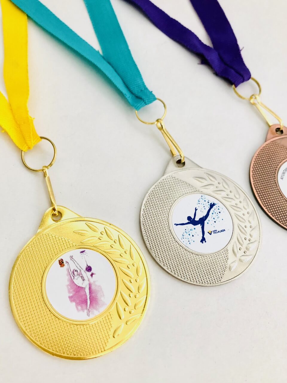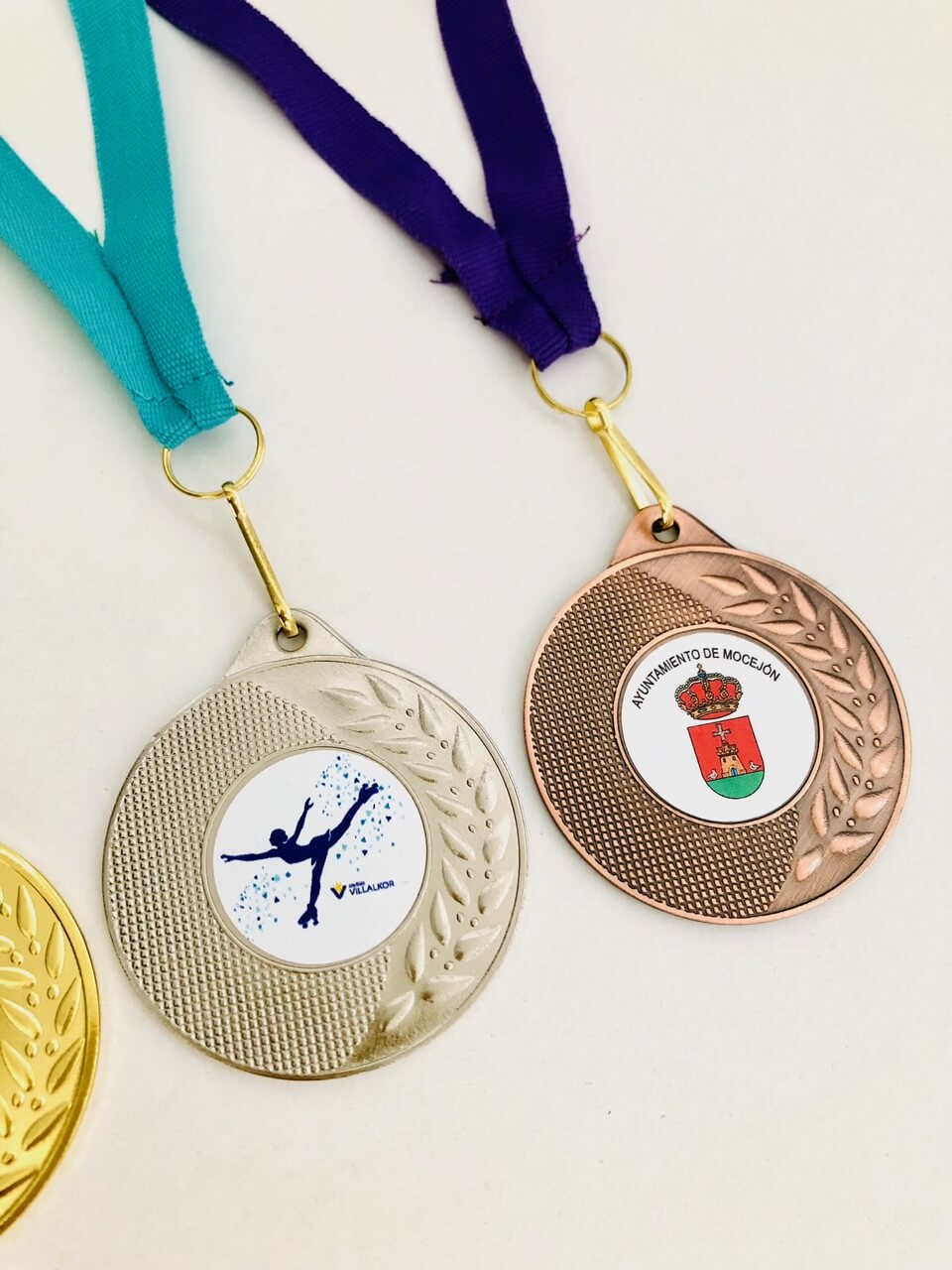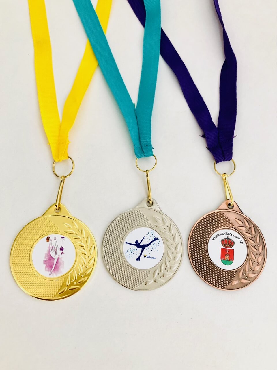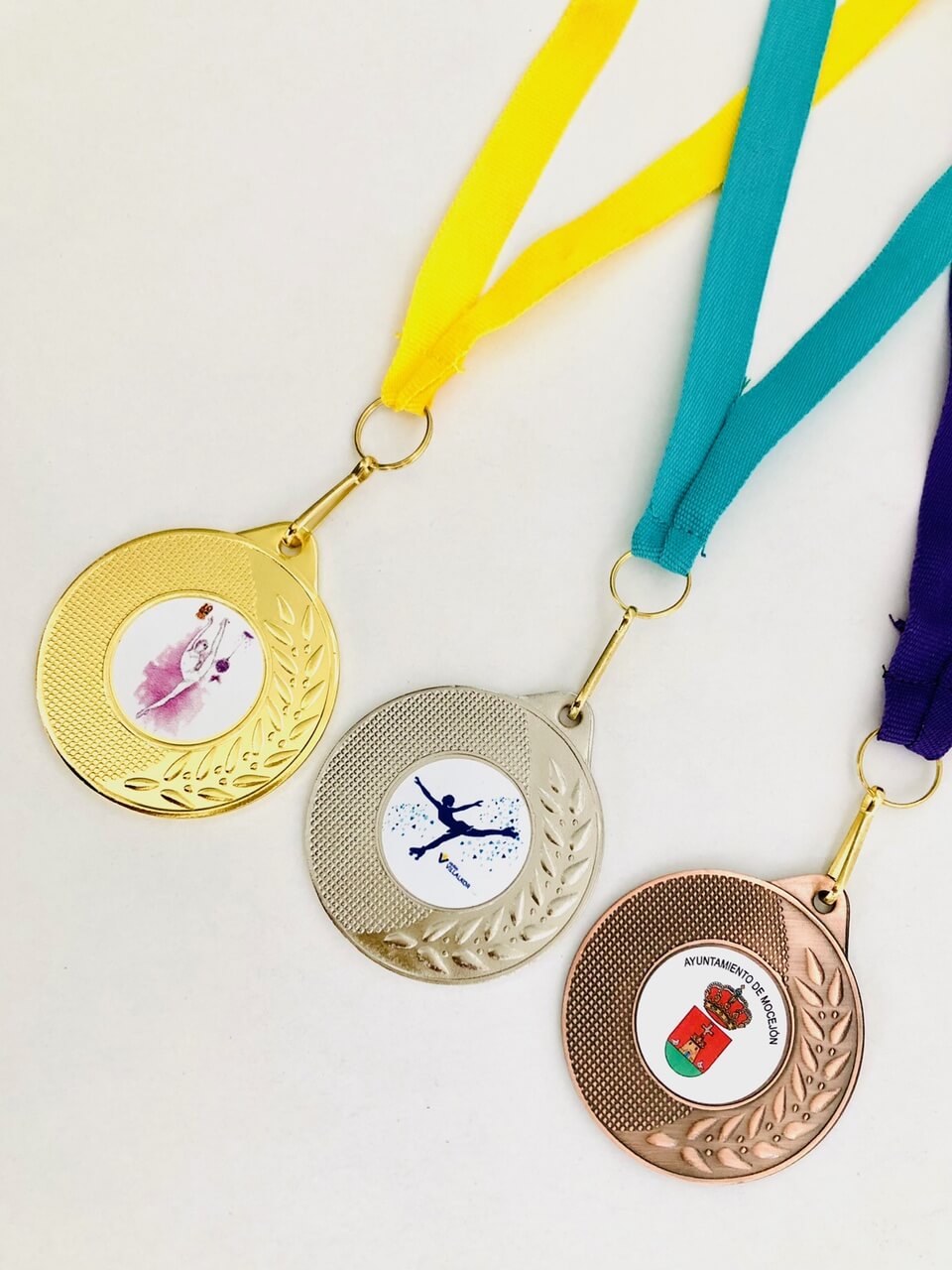 Medalla de hierro de 50mm de diámetro disponible en tres acabados, oro, plata y cobre, personalizada con logo adhesivo de vinilo delantero a color con el diseño de su evento. El mínimo de compra de este producto es de 50 unidades por color. Cinta con mosquetón de 10mm de ancho varios colores a elegir. Descuento especial si la montas tu mismo.